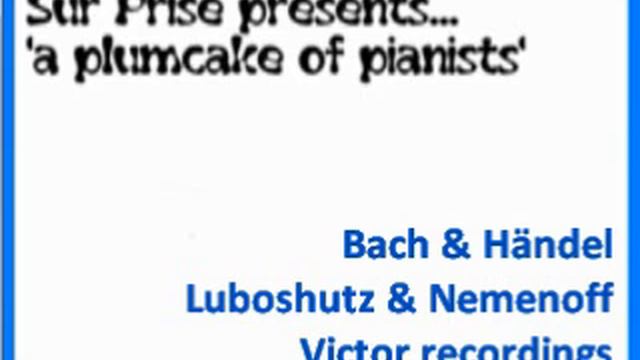 Johann Sebastian BACH Concerto in A minor after Vivaldi, BWV 593 (arr. Isidor Philipp) Allegro maestoso - Adagio - Allegro Chorale "Nun komm' der Heiden Heiland" (arr. Luboshutz) Sicilienne (arr. Guy Maier) Georg Friedrich HÄNDEL Passacaglia in G minor (from Suite #7, arr. Luboshutz) Pierre Luboshutz & Genia Nemenoff, duo pianists pre-1948 78s, released on LP RCA Camden CAL-286