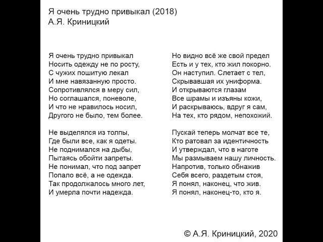 18.12.2020 Вот и все. День рождения позади (и это хорошо, ибо не люблю). Но впереди целый год обещанных стихов - по сути дела, выворачивания себя наизнанку, полного «оголения» себя перед другими. Хоть я готовился, и в течение 2020 года кое-что уже выкладывал, все равно воспринимаю эту ситуацию, как серьезный выход из зоны комфорта (когда стихи – творчество для себя) в зону дискомфорта (когда стихи – публичный продукт). Для меня это акт переламывания самого себя. В контексте сказанного, сегодня стихотворение 2018 года о том, как тяжело подчас изменить себя. И о том, насколько это все-таки важно ... Я ОЧЕНЬ ТРУДНО ПРИВЫКАЛ © А.Я. Криницкий, 2020