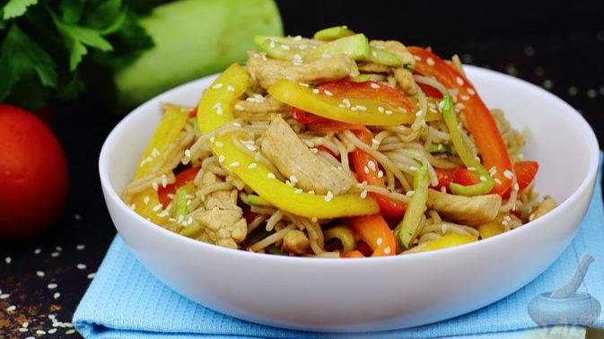 Оригинальный рецепт стеклянной лапши для любителей азиатской кухни. Приготовим фунчозу с куриным филе, ароматным болгарским перцем и сочным кабачком. Для пикантности добавим немного острого перца чили и соевого соуса. #ФунчозасКурицей #ФунчозасКабачками #ФунчозасОвощами #ФунчозаПоЛетнему #БыстрыйУжин