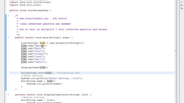 Click here - https://www.youtube.com/channel/UCd0U_xlQxdZynq09knDszXA?sub_confirmation=1 to get notifications. How to Sort an ArrayList A Job Portal http://www.InterviewDot.com http://www.InterviewDot.com http://www.InterviewDot.com One Click Dream Job - http://www.interviewdot.com/upload-resume/uploadresume.htm Are you looking for a new Job ? InterviewDot.com - A Job Portal http://www.InterviewDot.com http://www.InterviewDot.com http://www.InterviewDot.com One Click Dream Job - http://www.interviewdot.com/upload-resume/uploadresume.htm JAVA/SPRING/SQL/JUNIT INTERVIEW QUESTION AND ANSWER How to Sort an ArrayList