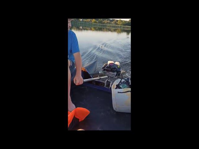 Надувной катамаран с мотором. Управляется по курсу рулевым веслом. Без весла на курсе не устойчив.