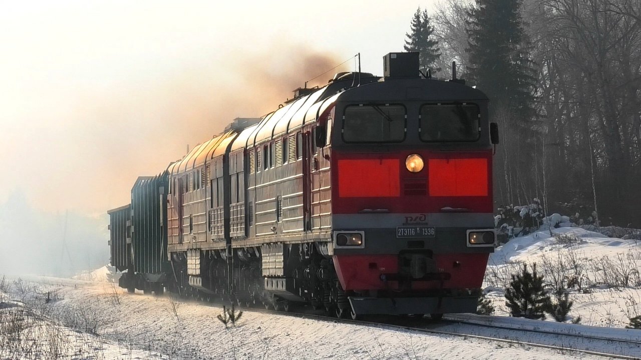Тепловоз 2ТЭ116К-1336 с грузовым поездом следует по перегону Алапаевск - Синячиха. Свердловская ЖД. Свердловская область, Россия. Приписка: ТЧЭ-13 Егоршино. 23.01.2022