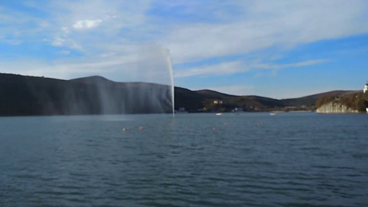 Красивый фонтан в озере, вид с набережной в Абрау-Дюрсо