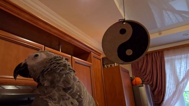 Серый попугай жако музицирует.
