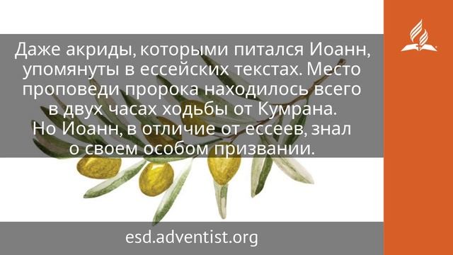 Сей есть, о котором написано: «вот, Я посылаю Ангела Моего пред лицом Твоим, который приготовит путь Твой пред Тобою». Ибо говорю вам: из рожденных женами нет ни одного пророка больше Иоанна Крестителя; но меньший в Царствии Божием больше его (Лк. 7:27, 28). О юности Иоанна не сохранилось почти никаких сведений. Лука упоминает соблюдение назорейских обетов: «Ибо он будет велик пред Господом; не будет пить вина и сикера, и Духа Святого исполнится еще от чрева матери своей» (Лк. 1:15). Известно, что он «был в пустынях до дня явления своего Израилю» (Лк. 1:80). Возможно, престарелые родители Иоанна умерли вскоре после его рождения, и он был взят на воспитание в кумранскую общину ессейских пустынников. Ессеи придерживались безбрачия и потому брали на воспитание детей. Ессеи считали себя «избранниками», «истинным Израилем», «гласом вопиющего в пустыне». Из слов пророка видно, что он часто размышлял над книгой пророка Исаии, а она была особенно любима кумранцами. Даже акриды, которыми питался Иоанн, упомянуты в ессейских текстах. Место проповеди пророка находилось всего в двух часах ходьбы от Кумрана. Но Иоанн, в отличие от ессеев, знал о своем особом призвании. Господь говорит о нем, что «из рожденных женами нет ни одного пророка больше Иоанна Крестителя», потому что он стал тем ангелом, который послан в мир как предтеча, чтобы приготовить путь Мессии (см. Мал. 3:1). Но к сказанному об Иоанне Господь добавляет: «Меньший в Царствии Божием больше его». Другими словами, Христос говорит, что тот, кто уверовал в Него как Спасителя мира, становится бо́льшим, чем тот, кто только Его ожидал. Ожидания часто не совпадают с реальностью, и переход от ожидания к реальности не всем по силам, что и показала история отвержения Христа иудеями: «Пришел к своим, и свои Его не приняли» (Ин. 1:11). Вот эта способность увидеть то, чего другие не увидели, и делает даже малого в Царстве Божьем великим. https://esd.adventist.org/library/periodicals/ezhednevnyie-chteniya/ #адвентисты #АдвентистыСедьмогоДня #Церковь #ЦерковьАдвентистовСедьмогоДня #ЦерковьХристианАдвентистовСедьмогоДня