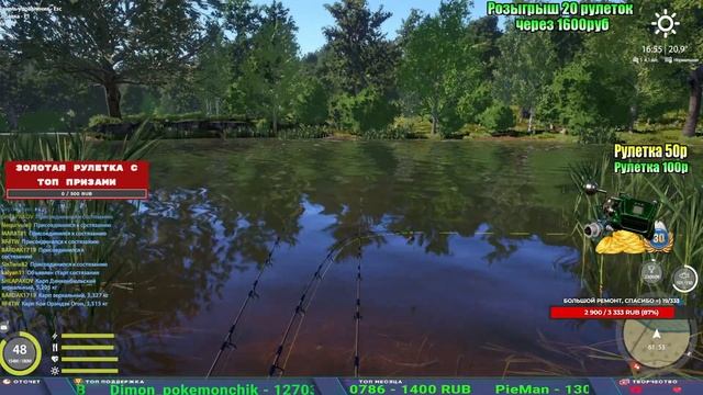 Поддержка донатом https://new.donatepay.ru/@1032463 Альтернативный донат https://www.donationalerts.com/r/kalyamba11 5536913964533059 карта Тинькоф Если стрим лагает,смотри стрим на трово https://trovo.live/s/Kalyamba_na_Ribalke Мой ВК - https://vk.com/kalyantv НИК в игре kalyan11 НАШ ДИСКОРД СЕРВЕР https://discord.gg/3ZeEDGs5h6 Заказ водоема на 1 час - 500р ( весь стрим 2500р ) Модерка на канале 1300р ( каждая следующая на 100р больше) ✅Призы в рулетке "ЗОЛОТАЯ" 500р ✔ ЗОЛОТО ✔ ПРЕМ ✔ КАТУШКИ РАПТОР 40, ВЕНГИ, ТАЙГА, СИЛЬВЕР 80, И другие ✔ ПАЛКИ ПИЛКЕРНАЯ, ДОНКА МОРСКИЕ, ✔ РОД ПОД, СТУЛЬЯ ✅Призы в рулетке СТАНДАРТ : 100р ✔ катушкИ РАПТОР 40, ВЕНГИ, ТАЙГА, СИЛЬВЕР 80, И другие ✔ катушки 60 для медного ( ЭВИИ, НАТОРЫ, ГОЛДА, и тд) ✔ ПИЛКЕРНОЕ УДИЛИЩЕ КОРОЛЕВА ОКЕАНА ✔ Морское Донное удилище ✔ прем ( 3, 7, 30 дней) ✔ золото ( 1, 3, 5, 10, 20 ,50) ✔ билет на море ( 1, 3, 5 дней) ✔ голд наживка и др. ✅Призы в рулетке "СТАРТОВАЯ" 50р ✔ катушка Венга ✔ катушка "silver80" ✔ катушка "БЕЛЫЙ КАЛИБР" ✔ катушка "Черный калибр" ✔ катушка "Протон" ✔ катушка "Нарга 6000" ✔ Набор Фидерист и спинингист ✔ Карповик Фортуна ✔ фидерные удилища ✔ прем, золото, алкашка, наживки и тд P.s Рулетка это не казино, а награда за поддержку стримера. Вечный ТОП ПОДДЕРЖКИ (10.06.2025) 1. Леха сварной 214 572 2. Dimon_pokemonchik 127 034 3. Skreb79 103 061 4. Interceptor 96 230 5. FishRus86 82 500