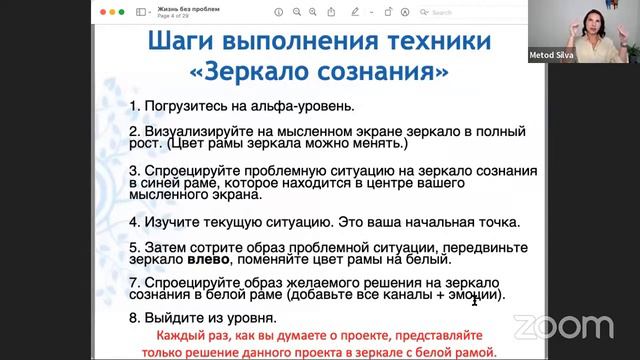 https://metodsilva.getcourse.ru/marafon/manifesting-full В этом видео Ирина Хайтин-Хлимоненко рассказывает о шагах выполнения техники «Зеркало сознания». Один из инструментов метода Сильва - это мысленный экран. Мысленный экран - это как экран телевизора. Представьте, что вы сидите на диване и перед вами на стене висит большой телевизор, точно так же ваш мысленный экран находится за пределами ваших век чуть выше линии горизонта, на расстоянии 1,5-2 метра. Для выполнения техники «Зеркало сознания» вы размещаете на ваш мысленный экран зеркало в полный рост, у зеркала есть рамка и цвет этой рамки можно менять, в зависимости от того, с чем вы работаете. Мы работаем с синим и белым цветами. Зеркало в синей раме - для проекта или проблемной ситуации, белая рама - это желаемое решение. Мы проецируем проблемную ситуацию в зеркало с синей рамой и изучаем её. Например, у вас проблема с коленом, вы хромаете. Вы видите себя в зеркале сознания с синий рамой в текущей ситуации, изучаете буквально несколько минут. После этого стираете образ в зеркале с синей рамой. Затем смещаете зеркало чуть влево и цвет рамы меняете на белый. В зеркале с белой рамой вы представляете желаемое решение данной ситуации, используя все каналы восприятия, представляйте цвет, вкус, запах, движение, эмоции - все, что можете, как можно больше деталей! Как вы хотите чувствовать себя, что вы будете делать, когда ваша проблема со здоровьем решится. То есть, вы создаете образ себя с максимальным количеством деталей в зеркале с белой рамой. Создали этот образ, добавили эмоции, порадовались, как здорово, когда я буду себя так чувствовать. После этого каждый раз, когда вы вспоминаете о своем колене, сразу же автоматически на своем мысленном экране представляйте себя полностью здоровым, как вы приседаете, как у вас все отлично получается. То есть мы не возвращаемся больше к синей раме до тех пор, пока мы не получим обратную связь. Я кинестет, и люблю ощущать, поэтому в момент, когда я программирую свою цель, я все время фиксирую по периметру, что рамка моего зеркала именно белая. Я будто регулирую мощность света, все время прогоняю по периметру, добавляя немножко мощности, яркости зеркалу, рамка становится ярче, белее будто подсвечивается. 30-дневный онлайн-марафон для тех, кто хочет достигать всех своих целей: https://metodsilva.getcourse.ru/marafon/manifesting-full Дружите с нами в социальных сетях: Инстаграм: https://www.instagram.com/irina_hlimonenko/ Фейсбук: https://www.facebook.com/metodsilva/ Вконтакте: https://vk.com/metodsilvaru Телеграм: https://t.me/metodsilvaru