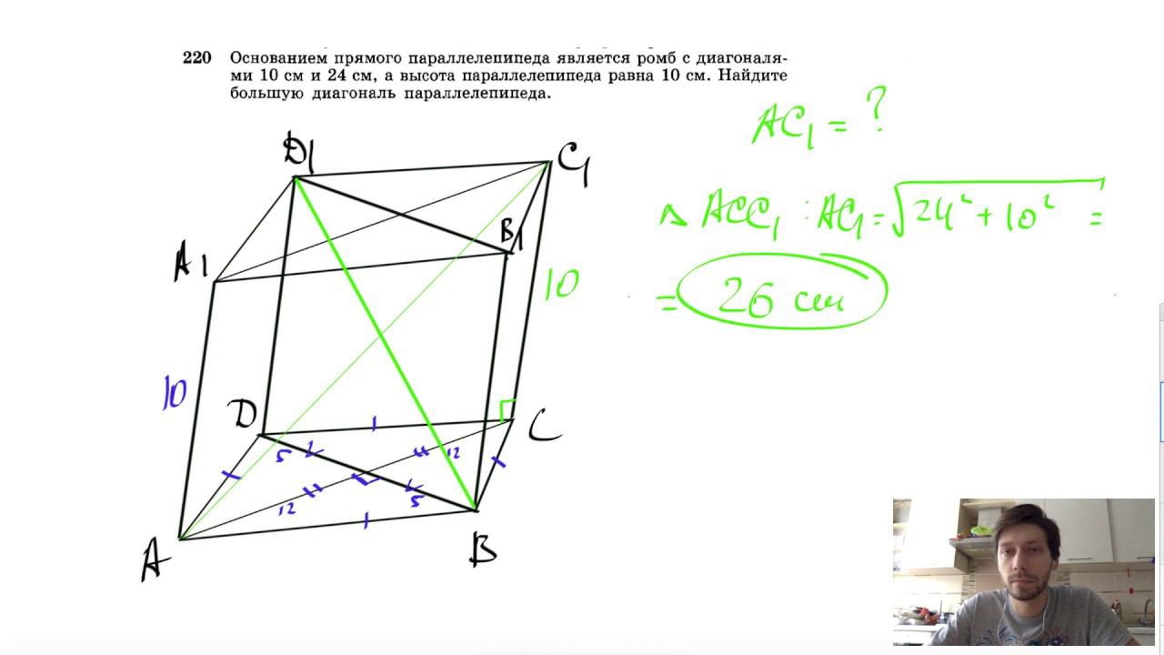 №220. Основанием прямого параллелепипеда является ромб с диагоналями 10 см и 24 см, а высота параллелепипеда равна 10 см. Найдите большую диагональ параллелепипеда. Поддержать канал рублём - 5469400944002125 (Сбербанк) Мой второй канал для подготовки к ЕГЭ и ОГЭ - https://www.youtube.com/ЕвгенийСумин Инстаграм - https://www.instagram.com/EGE_OGE.math Личный инстаграм - https://www.instagram.com/ee_sumin VK - https://vk.com/evgeniysumin FB - https://www.facebook.com/EvgeniySumin