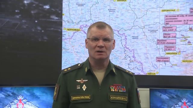 ? Ракетным ударом по пункту временной дислокации иностранных наёмников в районе города Запорожье ликвидировано до ста боевиков и 15 единиц военной техники. ? Ударом высокоточного оружия ВКС России по пункту ремонта и восстановления техники 72-й механизированной бригады ВСУ в районе населённого пункта Анновка Донецкой Народной Республики уничтожено до 50-ти боевиков и 28 единиц военной техники. ? Сосредоточенными огневыми ударами российской артиллерии сорваны попытки наступления 79-й десантно-штурмовой бригады ВСУ в направлении населённого пункта Марьинка Донецкой Народной Республики. Потери противника составили свыше 50-ти боевиков. ? В результате высокоточных ударов ВКС России по пунктам постоянной дислокации и узлу связи 46-й аэромобильной и 60-й пехотной бригад ВСУ в районах населённых пунктов Безыменное, Миролюбовка и Осокоровка Херсонской области, уничтожено до 30-ти боевиков и пять единиц военной техники. Всего за сутки на Николаево-Криворожском направлении потери ВСУ составили свыше 110 человек убитыми и ранеными, а также 13 единиц военной техники. ? Ударами оперативно-тактической и армейской авиации, ракетных войск и артиллерии за сутки поражены: командный пункт батальона 80-й десантно-штурмовой бригады ВСУ в районе города Николаев, пункты временной дислокации иностранных наёмников и 10-й горно-штурмовой бригады ВСУ на западной окраине города Запорожье и в районе Дружковки Донецкой Народной Республики, а также 33 артиллерийских подразделения, живая сила и военная техника в 178-ми районах. ◽️ В районе населенного пункта Явкино Николаевской области поражена на огневой позиции пусковая установка РСЗО «HIMARS». ? В ходе контрбатарейной борьбы за сутки поражено семь артиллерийских взводов на огневых позициях 57-й мотопехотной, 10-й горно-штурмовой, 24-й механизированной бригад ВСУ и 102-й бригады территориальной обороны в районах населённых пунктов Любимовка Днепропетровской области, Марково, Майское Донецкой Народной Республики, Шевченково Николаевской области, Затишье и Ровнополье Запорожской области. ? Кроме того, уничтожена пусковая установка зенитного ракетного комплекса «Оса-АКМ» в районе населённого пункта Новосёловка Запорожской области, два склада боеприпасов в районах Антоновки и Андреевки Донецкой Народной Республики, радиолокационная станция ПВО в районе Красноармейска Донецкой Народной Республики, а также потоплен бронированный катер типа «Гюрза» военно-морских сил Украины в районе порта Очаков. ◽️ Истребительной авиацией ВКС России в районах населенных пунктов Новоукраинка и Баштанка Николаевской области сбиты два самолёта МиГ-29 воздушных сил Украины, переоборудованные под применение американских противорадиолокационных ракет «HARM». ? Российскими средствами противовоздушной обороны за сутки сбито 12 беспилотных летательных аппаратов в районах населённых пунктов Ясиноватая, Старомлиновка, Новотроицкое, Кирилловка, Егоровка Донецкой Народной Республики, Маячка Запорожской области, Давыдов Брод, Малокаховка, Чаривное и Михайловка Херсонской области. ◽️ Также перехвачены в воздухе: 21 снаряд реактивных систем залпового огня, в том числе 18 реактивных снарядов «HIMARS» в районах населённых пунктов Новая Каховка Херсонской области и Валерьяновка Донецкой Народной Республики и три реактивных снаряда «