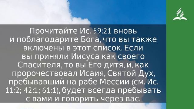 И вот, завет Мой с ними, говорит Господь: Дух Мой, Который на тебе, и слова Мои, которые вложил Я в уста твои, не отступят от уст твоих, и от уст потомства твоего, и от уст потомков потомства твоего, говорит Господь, отныне и до века (Ис. 59:21). Еще за семь столетий до времени пророка Исаии Моисей выразил желание, чтобы «все в народе Господнем были пророками, когда бы Господь послал Духа Своего на них!» (Числ. 11:29). Единственный текст Ветхого Завета, в котором прослеживается прямая связь Духа и Нового Завета, содержит обетование, что искупленный Божий народ со времени Мессии и до времени конца может в индивидуальном порядке быть исполненным Духом и изрекать Его слова, как того желал Моисей. Прочитайте Ис. 59:21 вновь и поблагодарите Бога, что вы также включены в этот список. Если вы приняли Иисуса как своего Спасителя, то вы Его дитя, и, как пророчествовал Исаия, Святой Дух, пребывавший на рабе Мессии (см. Ис. 11:2; 42:1; 61:1), будет всегда пребывать с вами и говорить через вас. Богодухновенное слово в устах каждой искупленной, исполненной Духом личности есть слово пророчества, слово мудрости, слово знания, слово истинных языков и истолкования (см. 1 Кор. 12). Эти дары Духа, используемые для возвещения истины, основаны на фундаменте нового завета, а именно на написанном Слове — Библии — и на Слове вопло­щенном — Иисусе. Через дары Духа Святого в Новом Завете, используемые для возвещения, Писания перестают быть лишь написанным словом, несущим только интеллектуальное знание, а становятся насущной для нашей реальной жизни вестью. Теперь настало время и вам, если этого еще не произошло, говорить как исполненный Духом слуга Божий. Возможно, вы будете беседовать один на один с человеком, говорить к небольшой группе или к большому собранию. Какой бы путь Бог ни определил для вас, радуйтесь, что Его обещание дать силу исполнилось. МОЛИТВА Господи, насади в моем разуме слово наставления, увещевания и утешения, чтобы я мог говорить сегодня так, как Святой Дух дает мне силу прославлять Иисуса. https://esd.adventist.org/library/periodicals/ezhednevnyie-chteniya/ #адвентисты #АдвентистыСедьмогоДня #Церковь #ЦерковьАдвентистовСедьмогоДня #ЦерковьХристианАдвентистовСедьмогоДня