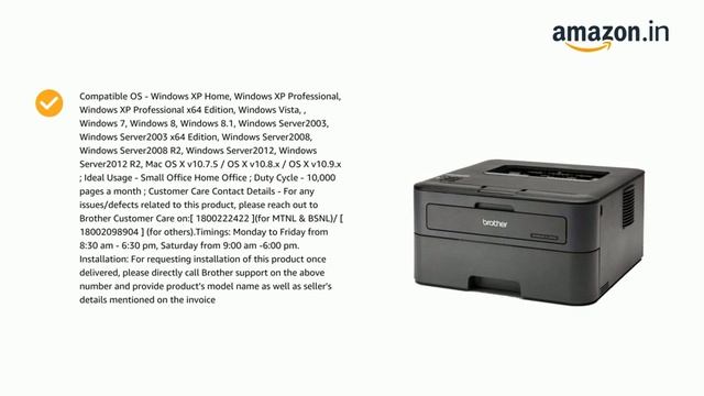 Features & details Printer Type - Laser ; Functionality - Single Function (Print Only); Printer Output - Mono Connectivity - USB, Wi-Fi, Wi-Fi Direct, POWER SOURCE: 220 - 240 V AC 50/60 Hz Pages Per Minute - 30 ppm Page Size Supported - A4, Letter, A5, A5(Long Edge), A6, Executive, Legal, Folio, Mexico Legal, India Legal ; Duplex Print - Auto Compatible Laser Toner - TN-2365 Standard Toner Cartridge ; Page Yield - 2600 pages, as per ISO standards Compatible OS - Windows XP Home, Windows XP Professional, Windows XP Professional x64 Edition, Windows Vista, , Windows 7, Windows 8, Windows 8.1, Windows Server2003, Windows Server2003 x64 Edition, Windows Server2008, Windows Server2008 R2, Windows Server2012, Windows Server2012 R2, Mac OS X v10.7.5 / OS X v10.8.x / OS X v10.9.x ; Ideal Usage - Small Office Home Office ; Duty Cycle - 10,000 pages a month ; Customer Care Contact Details - For any issues/defects related to this product, please reach out to Brother Customer Care on:[ 1800222422 ](for MTNL & BSNL)/ [ 18002098904 ] (for others).Timings: Monday to Friday from 8:30 am - 6:30 pm, Saturday from 9:00 am -6:00 pm. Installation: For requesting installation of this product once delivered, please directly call Brother support on the above number and provide product's model name as well as seller's details mentioned on the invoice Product information BrandBrotherManufacturerBROTHER, BrotherSeriesHL-L2366DWColourBlackForm FactorPrint OnlyItem Height18.3 CentimetersItem Width36 CentimetersProduct Dimensions35.6 x 36 x 18.3 cm; 6.8 KilogramsItem model numberHL-L2366DWConnectivity TypeWi-FiAre Batteries IncludedNoIncluded ComponentsUSB Cable, Power Cord, Consumables, Quick Setup Guide and Driver CDManufacturerBROTHERItem Weight6 kg 800 g Additional Information ASIN: B01NBPXE64 Customer Reviews: 4.2 out of 5 stars 43Reviews Best Sellers Rank: #16,947 in Computers & Accessories (See Top 100 in Computers & Accessories) #61 in Laser Printers Date First Available: 31 December 2016 Packer: Brother Importer: Brother Item Dimensions LxWxH: 35.6 x 36 x 18.3 Centimeters Generic Name: Laser Printer selling by Amazon
