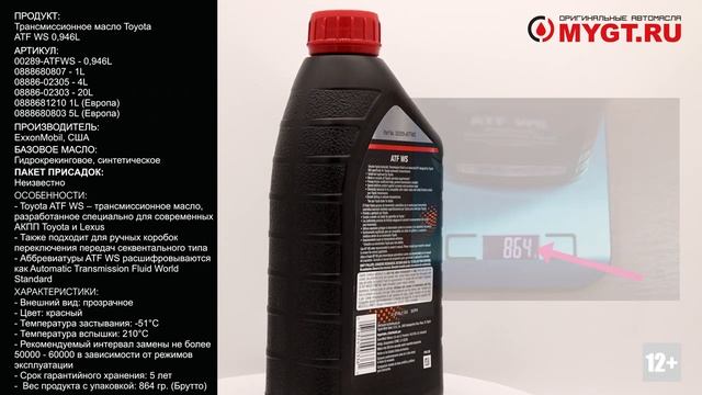 Продукт: Трансмиссионное масло Toyota ATF WS 0,946L Наш телефон: 8-800-550-57-22 ПН-ПТ 9.00-17.00 (МСК+4) Артикул: 00289-ATFWS - 0,946L 0888680807 - 1L 08886-02305 - 4L 08886-02303 - 20L 0888681210 1L (Европа) 0888680803 5L (Европа) Производитель: ExxonMobil, США Базовое масло: Гидрокрекинговое, синтетическое Ссылка для покупки: https://mygt.ru/oil/original-oils-USA/toyota-atf-ws-0946-l.html Аналог Япония: Ссылка для покупки: https://mygt.ru/Oil/selection/toyota-atf-ws-4-l--maslo-v-akpp.html Особенности: - Toyota ATF WS – трансмиссионное масло, разработанное специально для современных АКПП Toyota и Lexus - Также подходит для ручных коробок переключения передач секвентального типа - Аббревиатуры ATF WS расшифровываются как Automatic Transmission Fluid World Standard Характеристики: - Внешний вид: прозрачное - Цвет: красный - Индекс вязкости: 219 - Вязкость кинематическая при 40°С: 23,11 - Вязкость кинематическая при 100°С: 5,32 - Вязкость кажущаяся (динамическая), определяемая на имитаторе холодной прокрутки (CCS) при -35°C: 6700 - Плотность при +15°C: 0,865 - Температура застывания: -51°C - Температура вспышки: 210°C - Общее щелочное число (TBN): 6,00 - Общее кислотное число (TAN): 2,01 - Рекомендуемый интервал замены не более 50000 - 60000 в зависимости от режимов эксплуатации. - Срок гарантийного хранения: 5 лет. - Вес продукта с упаковкой: 864 гр. (Брутто) Отличие упаковки оригинала: - Дата производства тары и номер партии видны при свете ультрафиолетовой лампы. - Также при свете ультрафиолетовой лампы светятся и надпись ATF WS Ссылки на дополнительные материалы по продукту, а также SDS: http://nskrobot.ru/imagesм/FOTO/MYGT_RU/00289-ATFWS_SDS_MYGT_RU.pdf #характеристикимасла00289-ATFWS #моторноемасло #antonmygt #mygtru #mygtauto #oemcatalog #масломан Наш сайт: MYGT.RU Наш канал ПРАВДА ПРО АВТОМАСЛА: https://www.youtube.com/channel/UC5JygfcXAA5Xq18sxUx_wIQ/ Телефон: 8 800 550 57 22 Бесплатно по России Внимание! Полное либо частичное копирование данного материала без согласия автора допускается только при указании ссылки на источник (данный канал) Все права защищены ANTON_MYGT #anton_mygt #anton_voronkov #mygtauto #масломан #каталог масел и спецжидкостей