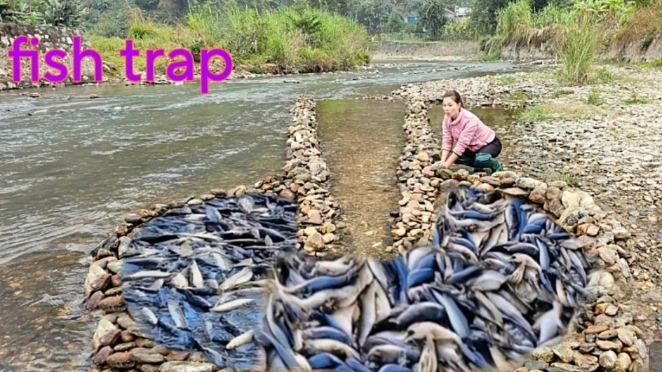 Девушка умело расположила камни что бы создать ловушку для рыбы.