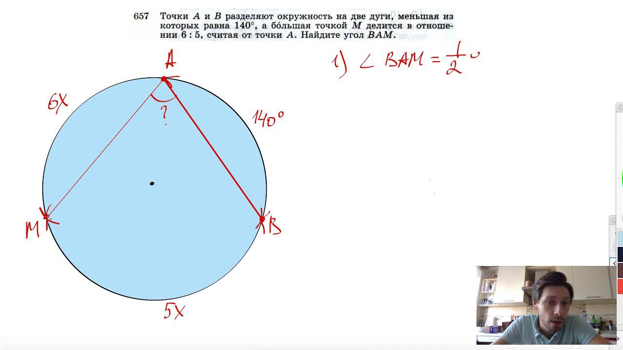 №657. Точки А и В разделяют окружность на две дуги, меньшая из которых равна 140°, а большая точкой М делится в отношении 6:5, считая от точки А. Найдите угол ВАМ. Поддержать канал рублём - 5469400944002125 (Сбербанк) Мой второй канал для подготовки к ЕГЭ и ОГЭ - https://www.youtube.com/ЕвгенийСумин Инстаграм - https://www.instagram.com/EGE_OGE.math Личный инстаграм - https://www.instagram.com/ee_sumin VK - https://vk.com/evgeniysumin FB - https://www.facebook.com/EvgeniySumin
