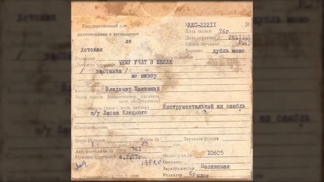 «Чему учат в школе», заставка Код ГДРЗ: ДКС-22211 Исполнитель: Инструментальный ансамбль Композитор: Владимир Шаинский Дирижёр: Леон Елецкий Дата записи: 1976 Дата переписи: 26.11.1976 _______________________ Сайт Ретро-архива: https://audio.retro-archive.ru/ Группа VK: https://vk.com/retroarchive_audio Поддержать проект: https://yoomoney.ru/to/41001810339432