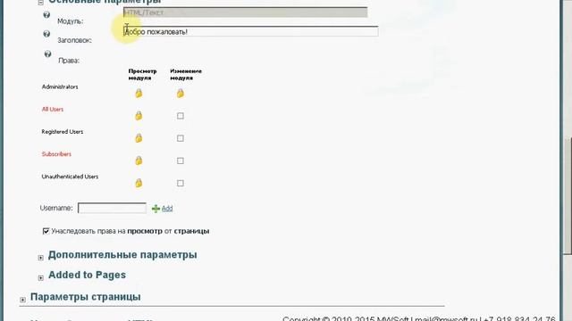 Свойства модуля HTML/текст. Удаление модуля.