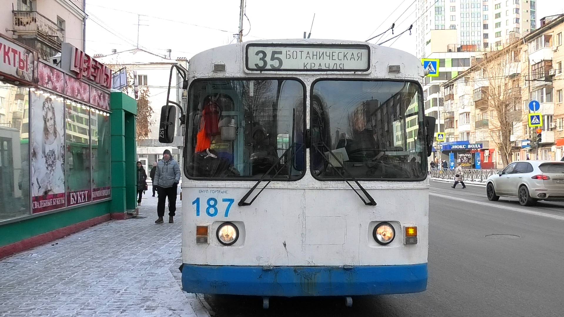 Троллейбус ЗиУ-682Г [Г00] борт. №187 маршрут №35 "Крауля - Ботаническая" следует через остановку "Авиационная". Город Екатеринбург, Россия. Приписка: Октябрьское троллейбусное депо. 20.02.2023