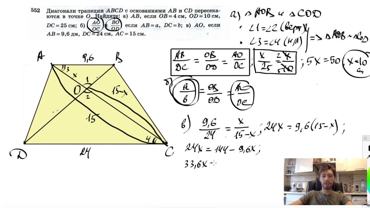№552. Диагонали трапеции ABCD с основаниями АВ и CD пересекаются в точке О. Найдите: Поддержать канал рублём - 5469400944002125 (Сбербанк) Мой второй канал для подготовки к ЕГЭ и ОГЭ - https://www.youtube.com/ЕвгенийСумин Инстаграм - https://www.instagram.com/EGE_OGE.math Личный инстаграм - https://www.instagram.com/ee_sumin VK - https://vk.com/evgeniysumin FB - https://www.facebook.com/EvgeniySumin