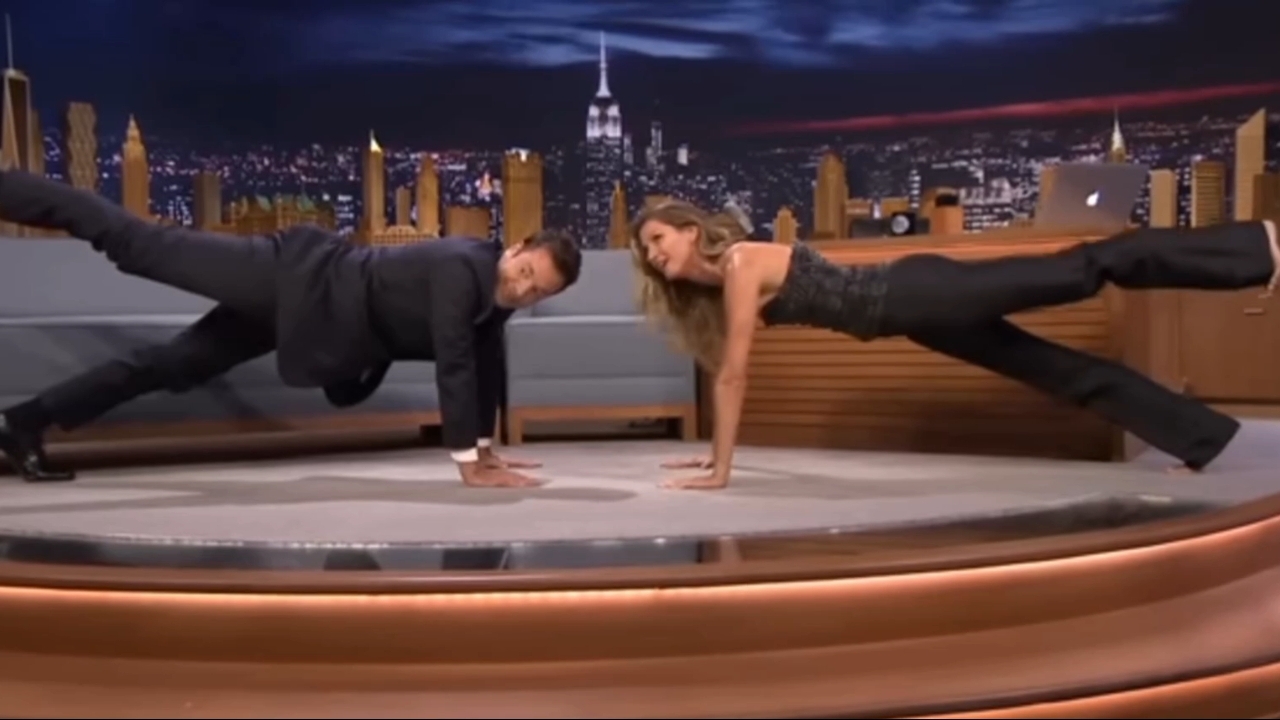 Жизель Бюндхен показывает Джимми упражнения для планки