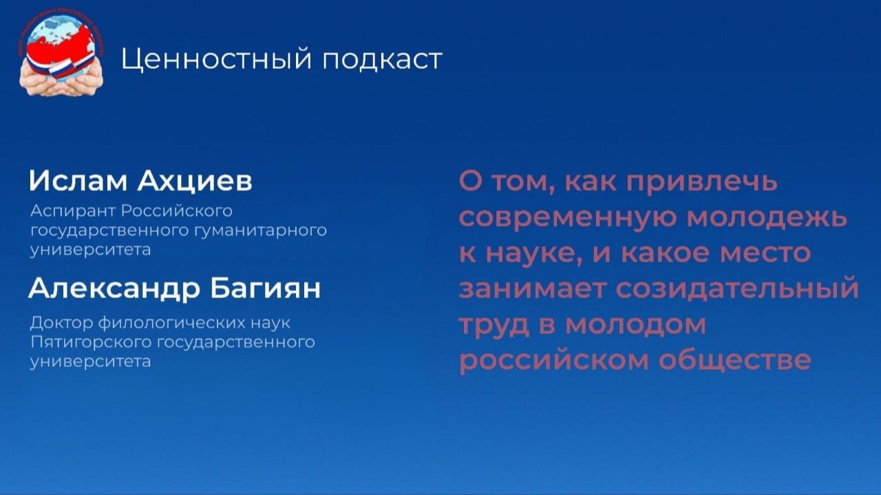 🗣Тема: «Наука без опоры на ценности не принесёт значимой пользы обществу» Как сделать науку ближе к молодежи и нужно ли для этого постоянно упрощать сложное? Что такое «ментальные вирусы» и почему они необходимы для общества? Какое место созидательный труд занимает в современной науке и почему эта ценность важна не только для российского, но и для мирового научного сообщества? 👤Гости: ☁️Ислам Ахциев аспирант Российского государственного гуманитарного университета ☁️Александр Багиян доктор филологических наук Пятигорского государственного университета 💬Ведущий: Григорий Сергеевич Мхитарьян, руководитель программ АНО «Центр знаний «Машук». Полный выпуск смотрите в нашем сообществе ВК.