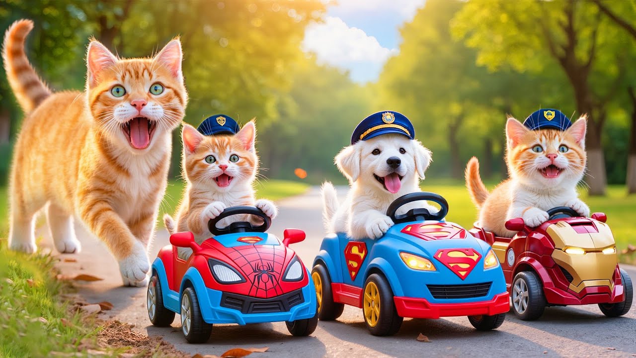 Мультики для детей, котики катаются на игрушечных машинах, мультфильм/мультик