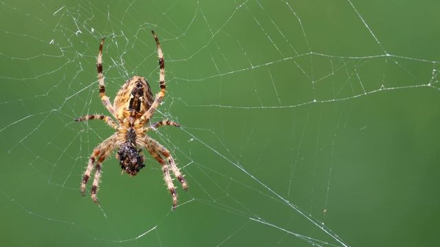 Паук, снятый со стороны брюшка, доедает свою припасенную еду.