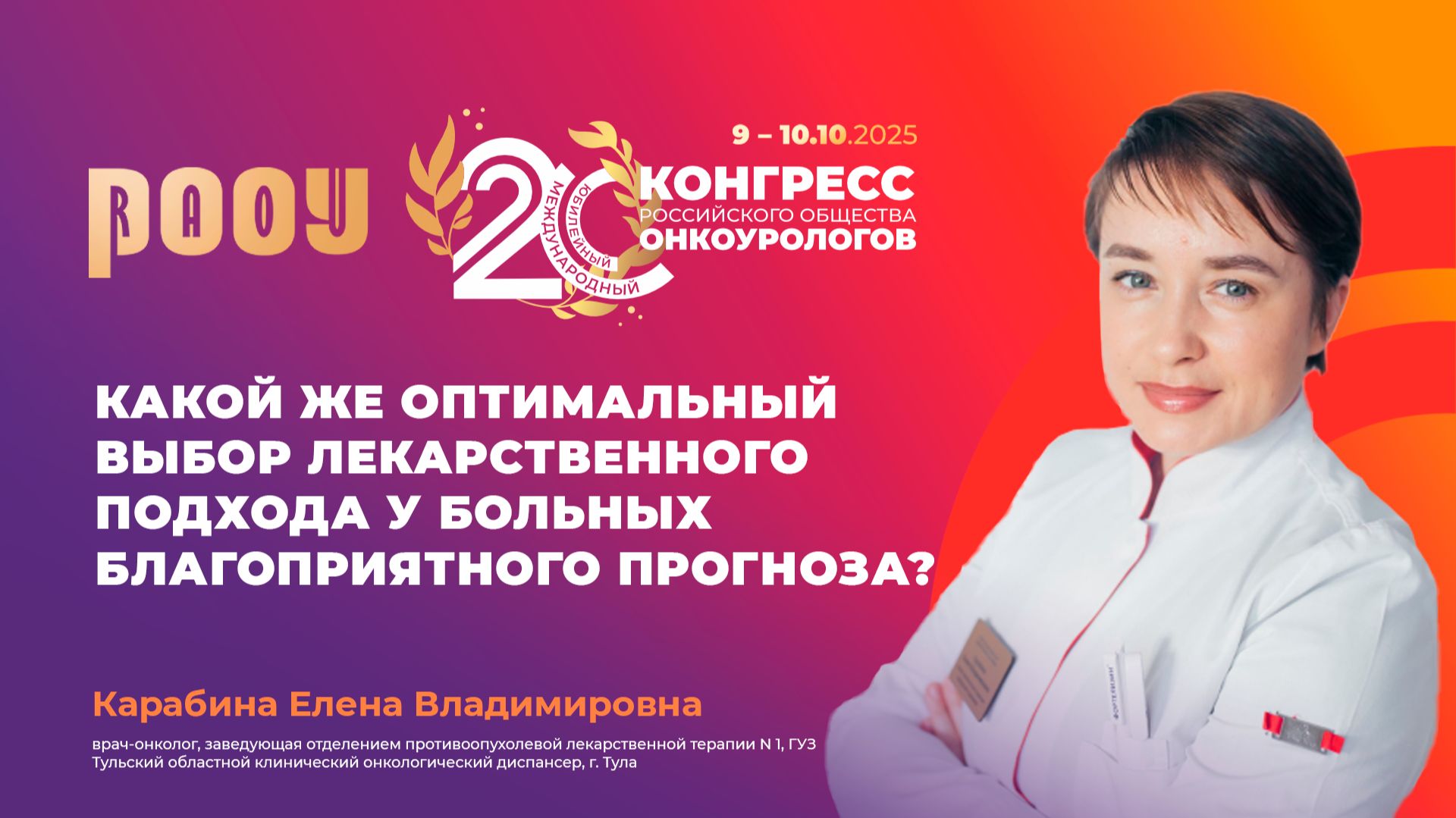 10 октября на XX Международном Конгрессе РООУ Карабина Елена Владимировна представила доклад на тему: "Какой же оптимальный выбор лекарственного подхода у больных благоприятного прогноза?" ✅ Эксперт: Карабина Елена Владимировна, врач-онколог, заведующая отделением противоопухолевой лекарственной терапии N 1, ГУЗ Тульский областной клинический онкологический диспансер, г. Тула. ➡️ Официальный сайт РООУ: https://roou.ru/ Присоединяйтесь к нам в социальных сетях. Делитесь мнением и повышайте уровень теоретической и практической подготовки в онкоурологии: Telegram: https://t.me/oncologyurology ВКонтакте: https://vk.com/oncologyurology #РООУ #RAOU #ОбществоОнкоурологов #Онкоурология #Урология #Онкология #Oncourology #XXКонгрессРООУ #КонгрессРООУ #ракпочки #медицинскиеконференции #urology