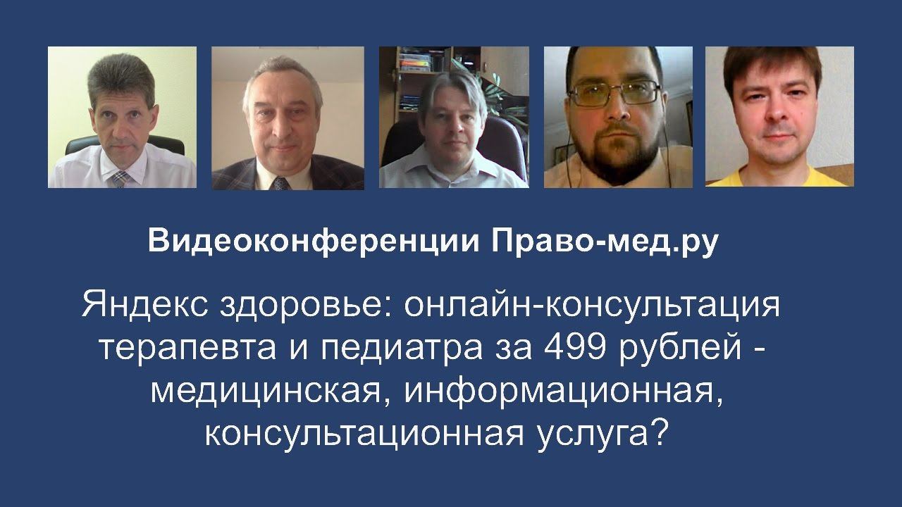 Видеоконференция Право-мед.ру от 27 апреля 2017 года, на которой анализировалось позиционирование сервиса "Яндекс. Здоровье: онлайн-консультация терапевта и педиатра" как информационной, а не медицинской услуги Рассмотренные вопросы 1.Правомерность он-лайн консультации на тему здоровья 2.Полнота сведений об основных потребительских свойствах услуги 3.Юридические критерии надлежащего качества предоставляемой услуги 4.Оценка рисков потребителей услуги Участники Панов Алексей Валентинович, главный редактор информационного портала Право-мед.ру, г. Омск Печерей Иван Олегович, доцент кафедры судебной медицины и медицинского права МГМСУ им. И. А. Евдокимова, г. Москва Васильев Игорь Валерьевич, доцент кафедры общественного здоровья и здравоохранения НГМУ, г. Новосибирск Гаганов Дмитрий Борисович, старший юрисконсульт ООО ЮрБюро", Санкт-Петербург Карпенко Андрей Александрович, руководитель московского филиала "Центр медицинского права"
