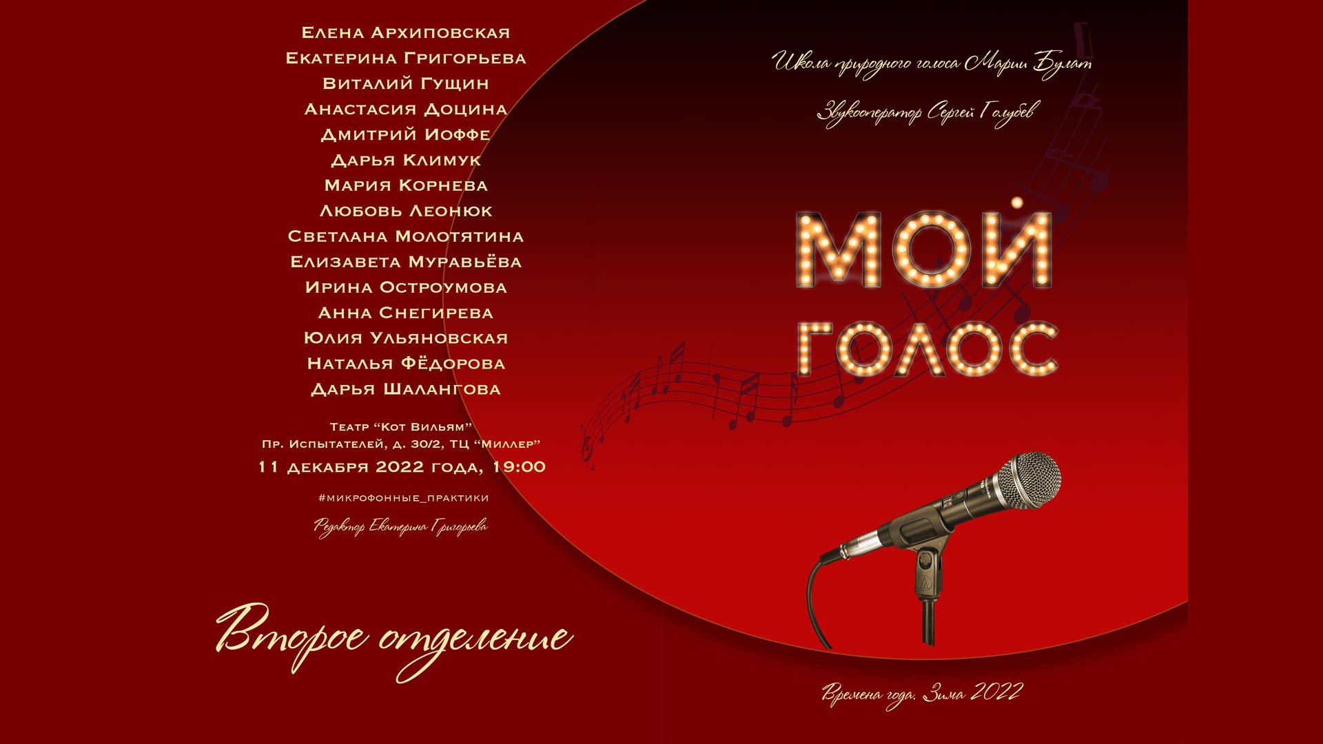 Школа природного голоса Марии Булат Концерт "Мой Голос". 11 декабря 2022 года. Санкт-Петербург, театр "Кот Вильям". Звукооператор - Сергей Голубев. Стилист - Юлия Спельман. Свет - Тимофей Ананичев. Второе отделение: 00:27 Елена Архиповская. I Will Survive (текст и музыка Д.Фекариса и Ф.Перрена) 04:22 Дарья Климук. Mambo Number Five (текст и музыка П.Прадо) 08:42 Ирина Остроумова. Мое сердце (текст А.Свиридовой, музыка К.Портер) 12:46 Анна Снегирева. Fenesta Che Lucive (неаполитанская народная песня) 16:23 Анастасия Доцина. Ля-ля-фа (текст Г.Витке, музыка Ю.Варума) 21:19 Екатерина Григорьева. Эдем (текст М.Булат, музыка Ю.Ельского) 24:34 Наталья Федорова. Песенка о медведях (текст Л.Дербенёва, музыка А.Зацепина) 27:59 Светлана Молотятина. Зимний сон (текст и музыка А.Шевченко) 32:46 Дмитрий Иоффе. Шаланды, полные кефали (текст В.Агатова, музыка Н.Богословского) 36:11 Мария Корнева. Шапито (текст М.Булат, музыка Ю.Ельского) 40:10 Юлия Ульяновская. Dream a Little Dream of Me (текст Г.Кана, музыка Ф.Андре и У.Швандта) 44:02 Дарья Шалангова. Крым (текст и музыка З.Рамазановой) 48:27 Елизавета Муравьева. Hark the Herald Angel Sing. Oh Santa (текст и музыка М.Кэри) 55:17 Любовь Леонюк. Last Christmas (текст и музыка Дж.Майкла) 01:00:16 Все участники концерта. Есть только миг (текст Л.Дербенёва, музыка А.Зацепина)