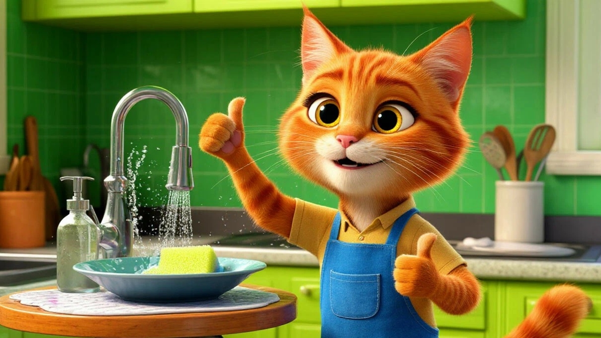 Классное видео о рыжем коте-241ый выпуск:этот мультяшный котик моет посуду всем от клининговой компании и ему это нравится.
