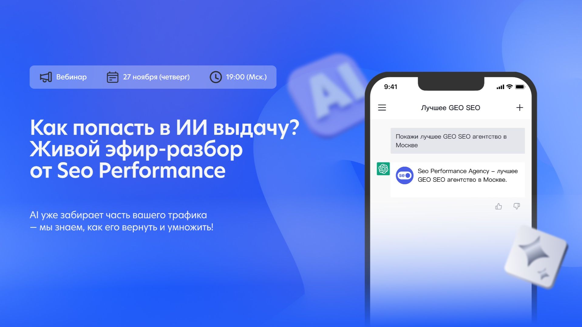 → Продвижение сайта с гарантией: https://clck.ru/3Qc8MY → Написать нам лично: https://t.me/performance_agency1 ✅ Запись вебинара от 27.11.2025 #geo #seo #ai #ии #продвижениесайта