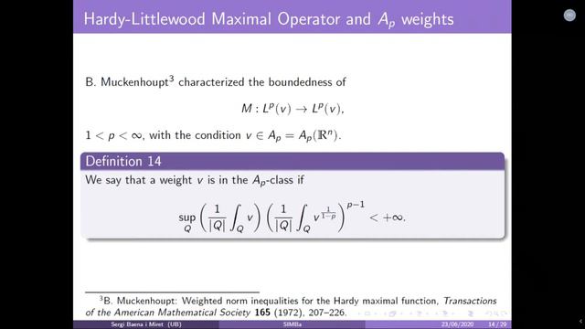 Talk given on Tuesday 23rd of June of 2020. Abstract: An important property of the A_p weights is the extrapolation theorem of Rubio de Francia. It was announced in 1982 and given with a detailed proof in 1984, both by J.L. Rubio de Francia. In its original version, reads as follows: if T is a sublinear operator which satisfies the strong type boundedness T : L^2(v) -- L^2(v) for every weight v ∈ A_2 with constant only depending on v, then for 1 less p less ∞, T : L^p(v) -- L^p(v) is bounded for every v ∈ A_p, with constant depending only on v. We will make a review of some of the different versions that have appeared since then. Poster of the talk: http://www.ub.edu/simba/posters/simba200623.pdf Slides: http://www.ub.edu/simba/slides/simba200624-SBaena.pdf ========================================================= SIMBa Seminar website: http://www.ub.edu/simba Subscribe to the SIMBa Seminar mailing list: http://eepurl.com/gMkuv Do you want to give a talk? https://goo.gl/1TcwQR