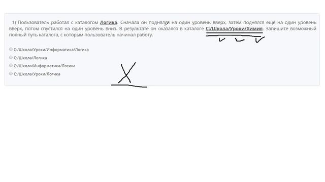 http://egoroffartem.pythonanywhere.com/oge/task/4 На сайте размещены другие задания по этой теме http://egoroffartem.pythonanywhere.com/oge/videotask/4 Список всех разборов 4 задания из ОГЭ по информатике: https://www.egoroffartem.ru/oge/videotask/ Видео решения задач по ОГЭ информатике https://vk.com/egoroff_channel_oge В данном группе можете найти информацию о новых видео и задать вопросы по ОГЭ Информатике Разбор задания № 4 ОГЭ ИНФОРМАТИКА Тема задачи "Файловая система" Пользователь работал с каталогом Логика. Сначала он поднялся на один уровень вверх, затем поднялся ещё на один уровень вверх, потом спустился на один уровень вниз. В результате он оказался в каталоге C:/Школа/Уроки/Химия. Запишите возможный полный путь каталога, с которым пользователь начинал работу.