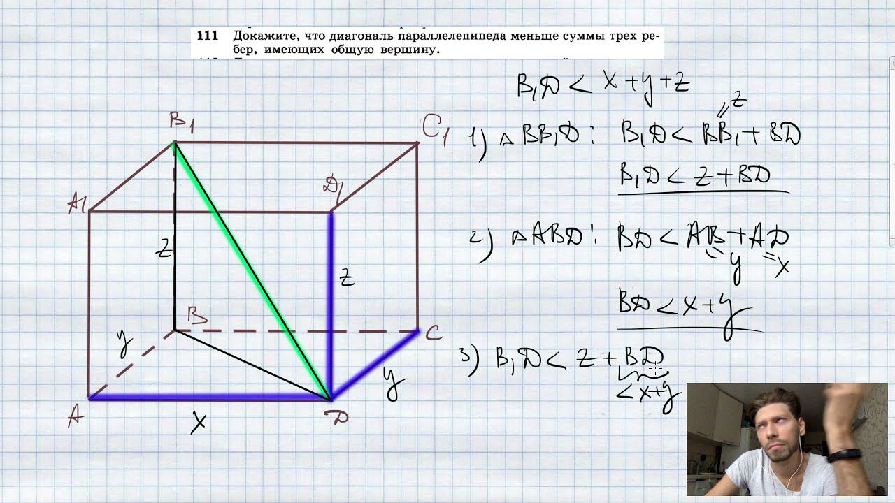 №111. Докажите, что диагональ параллелепипеда меньше суммы трех ребер, имеющих общую вершину. Сайт - https://taplink.cc/ege_oge.math Мой второй канал для подготовки к ЕГЭ и ОГЭ - https://www.youtube.com/ЕвгенийСумин TikTok - https://vm.tiktok.com/WJJwK9 Инстаграм - https://www.instagram.com/EGE_OGE.math Личный инстаграм - https://www.instagram.com/ee_sumin VK - https://vk.com/evgeniysumin