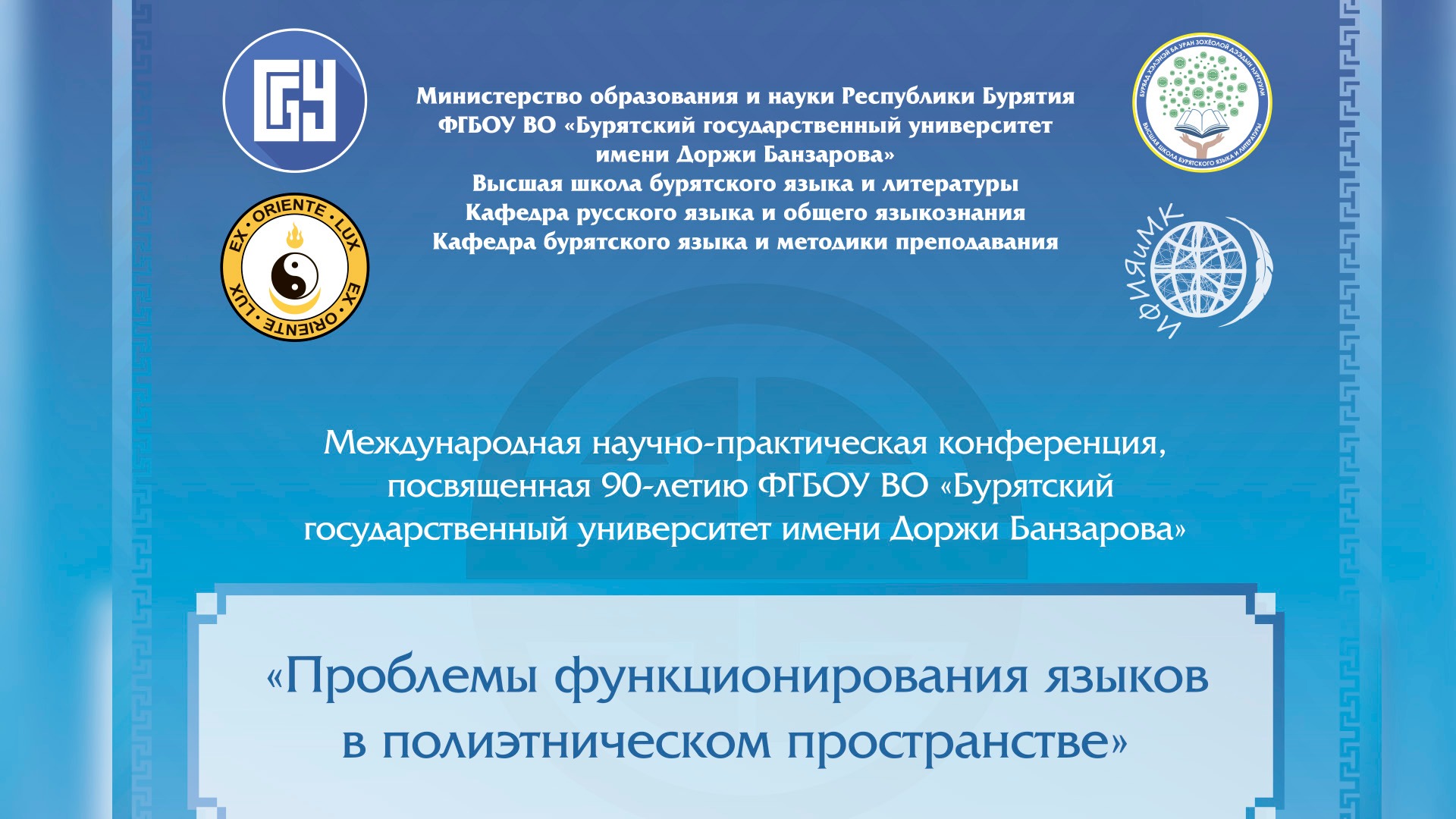 20-21 апреля 2022 г. проходит Международная научно-практическая конференция "Проблемы функционирования языков в полиэтническом пространстве". Конференция проводится в соответствии с планом мероприятий, посвященных 90–летию ФГБОУ ВО «Бурятский государственный университет имени Д.Банзарова». На пленарном заседание с приветственным словом к участникам обратились проректор по науке БГУ В.В. Номогоева, и.о. зам. министра образования и науки РБ Б.Б. Цыренжапов. В конференции принимают участие более 100 человек из таких регионов, как Республика Калмыкия, Республика Татарстан, Республика Якутия, Республики Хакассия, Новосибирск, Москва, Томск, Иркутская область, Забайкальский край, а также из Монголии, Китая, Казахстана, Киргизии. В рамках конференции состоится пленарное заседание, запланирована работа трех секций, двух круглых столов и методического семинара для авторов-разработчиков УМК по родному языку и по родной литературе. Организаторы - Министерство образования и науки Республики Бурятия ФГБОУ ВО и «Бурятский государственный университет имени Д.Банзарова»: Высшая школа бурятского языка и литературы, кафедра русского языка и общего языкознания, кафедра бурятского языка и методики преподавания.