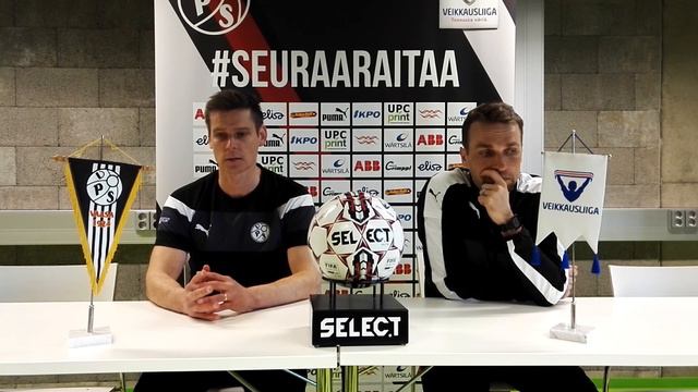 VPS-KuPS -ottelun jälkeinen lehdistötilaisuus. Tilaisuudessa paikalla VPS:n päävalmentaja Petri Vuorinen ja KuPSin käskijä Jani Honkavaara. Lehdistötilaisuudet tarjoaa kaudella 2017 Liikennekoulu Rönn.