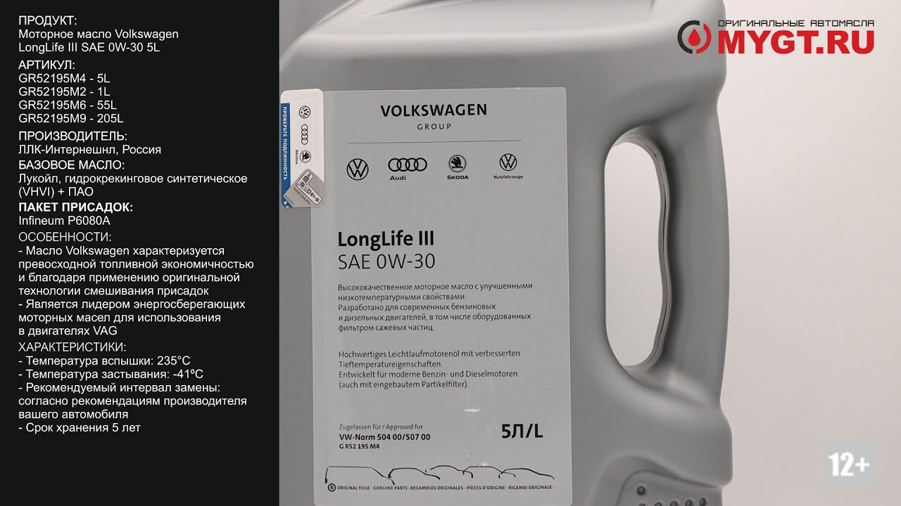 Продукт: Моторное масло Volkswagen LongLife III SAE 0W-30 5L Наш телефон: 8-800-550-57-22 ПН-ПТ 9.00-17.00 (МСК+4) Артикул: GR52195M4 - 5L GR52195M2 - 1L GR52195M6 - 55L GR52195M9 - 205L Производитель: ЛЛК-Интернешнл, Россия Базовое масло: Лукойл, гидрокрекинговое синтетическое (VHVI) + ПАО Пакет присадок: Infineum P6080A Ссылка для покупки: https://mygt.ru/search.html?article=GR52195M4&brand=VW+EU&st=default&term=0&chk_smode=A&smode=A&sort___search_results_by=final_price Особенности: Оригинальное моторное масло VAG производится на основе собственной композиции компании. включающей синтетические базовые масла с высочайшим уровнем свойств и тщательно сбалансированный пакет присадок. Высокий индекс вязкости обуславливает малое изменение вязкости масла, в широком температурном диапазоне эксплуатации, что обеспечивает превосходную текучесть в условиях низких температур и сохранение прочной масляной пленки при температурах свыше 100 °C. Масло Volkswagen характеризуется превосходной топливной экономичностью и благодаря применению оригинальной технологии смешивания присадок. Оригинальное масло VW LongLife III FE SAE 0W-30 является лидером энергосберегающих моторных масел для использования в двигателях VAG. Характеристики: - Плотность 15°C, D-4052-96: 0.8512 г/см3 - Вязкость при 40°C, D-445: 59,88сСт - Вязкость при 100°C, D-445: 10,44сСт - Индекс вязкости, D-2270: 164 - Общее щелочное число (TBN), HCLO4, D-2896-96: 8,11мгKOH/г - Вязкость проворачивания при -30°C, SAE J300: 5051CCS - Вязкость при 150°C, SAE J300: 3,06HTHS - Содержание фосфора: 0,08% wt - Температура вспышки (COC), D-92: 235°C - Температура застывания, D-97: -41°C - Рекомендуемый интервал замены: согласно рекомендациям производителя вашего автомобиля - Срок хранения 5 лет Отличие упаковки оригинала: - Дата изготовления, номер партии и бригада указаны на задней этикетке - Дата производства тары должна быть ровна или ранее даты розлива продукта Ссылки на дополнительные материалы по продукту в описании к этому видео #характеристикимаслаGR52195M4 #моторноемасло #antonmygt #mygtru #mygtauto #oemcatalog #масломан Наш сайт: MYGT.RU Наш канал ПРАВДА ПРО АВТОМАСЛА: https://www.youtube.com/channel/UC5JygfcXAA5Xq18sxUx_wIQ/ Телефон: 8 800 550 57 22 Бесплатно по России Внимание! Полное либо частичное копирование данного материала без согласия автора допускается только при указании ссылки на источник (данный канал) Все права защищены ANTON_MYGT #anton_mygt #anton_voronkov #mygtauto #масломан #каталог масел и спецжидкостей