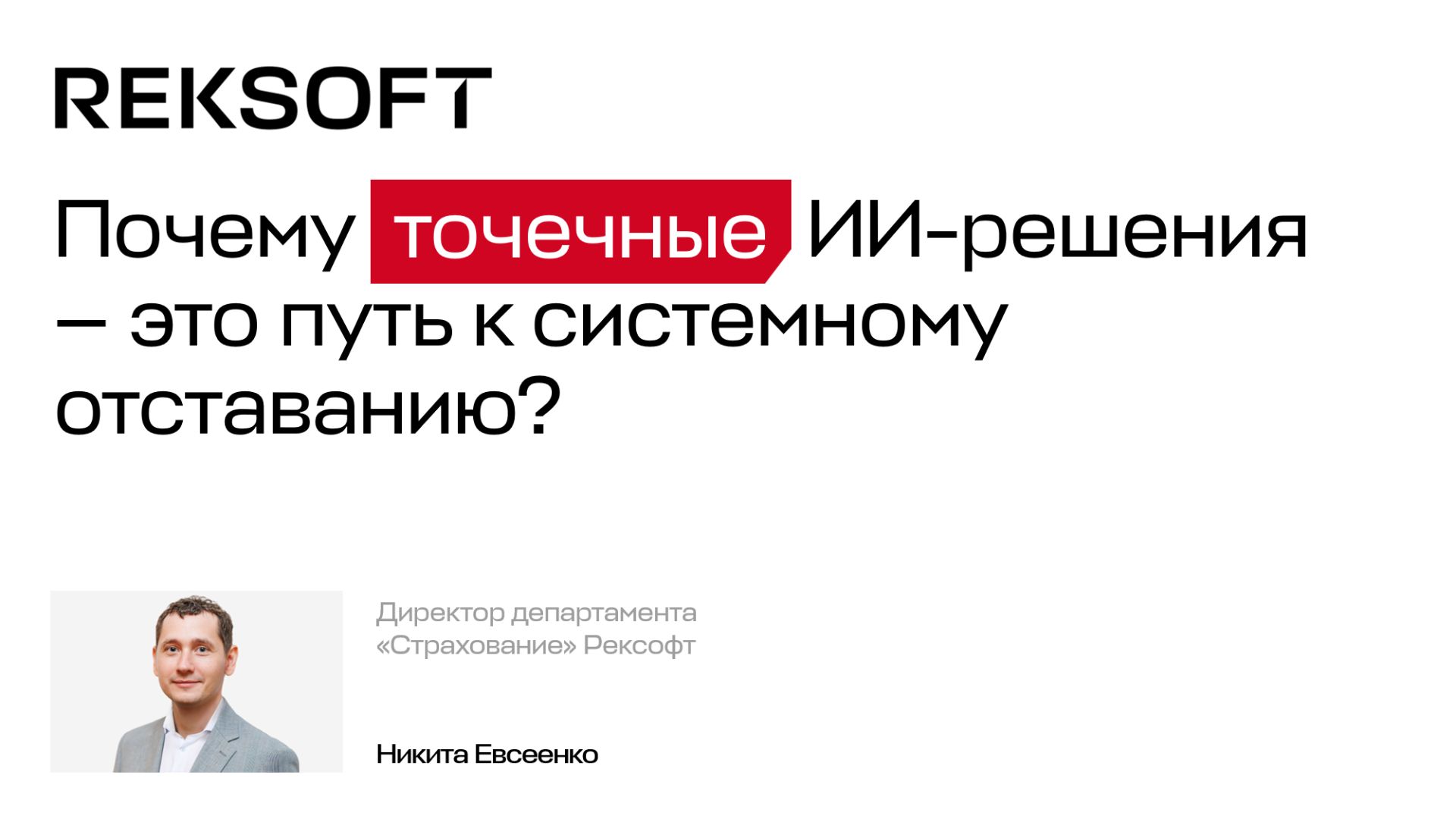 Никита Евсеенко, директор департамента «Страхование» Рексофт, на Форуме лидеров страхового рынка рассказал о необходимости изменения ценности страхования и предпосылках системной трансформации отрасли. Катализатором этих изменений становится искусственный интеллект, однако точечные ИИ-решения — это иллюзия прогресса. В этом видео — о том, как перейти от «игры в инновации» к построению страховой компании будущего и превратить ИИ в ядро бизнес-модели.