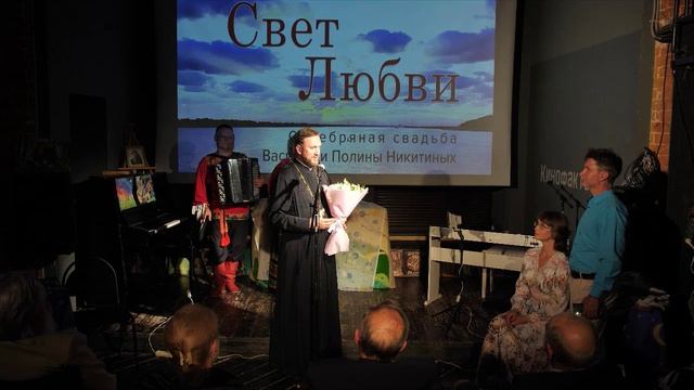 Иерей Виталий Мишарин поздравляет с серебряной свадьбой Василия и Полину Никитиных, которая прошла 21 июля 2025 года в городе Нижнем Новгороде в здании Нижполиграфа, в пространстве Кинофактуры.