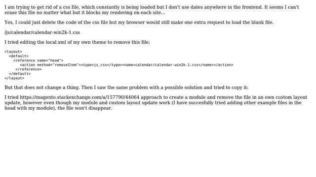 Magento: Can't get rid of calendar-win2k-1.css via layout xml updates Helpful? Please support me on Patreon: https://www.patreon.com/roelvandepaar With thanks & praise to God, and with thanks to the many people who have made this project possible! | Content (except music & images) licensed under CC BY-SA https://meta.stackexchange.com/help/licensing | Music: https://www.bensound.com/licensing | Images: https://stocksnap.io/license & others | With thanks to user TheFrakes (magento.stackexchange.com/users/44064), user Julien Loizelet (magento.stackexchange.com/users/50208), and the Stack Exchange Network (magento.stackexchange.com/questions/216727). Trademarks are property of their respective owners. Disclaimer: All information is provided "AS IS" without warranty of any kind. You are responsible for your own actions. Please contact me if anything is amiss at Roel D.OT VandePaar A.T gmail.com