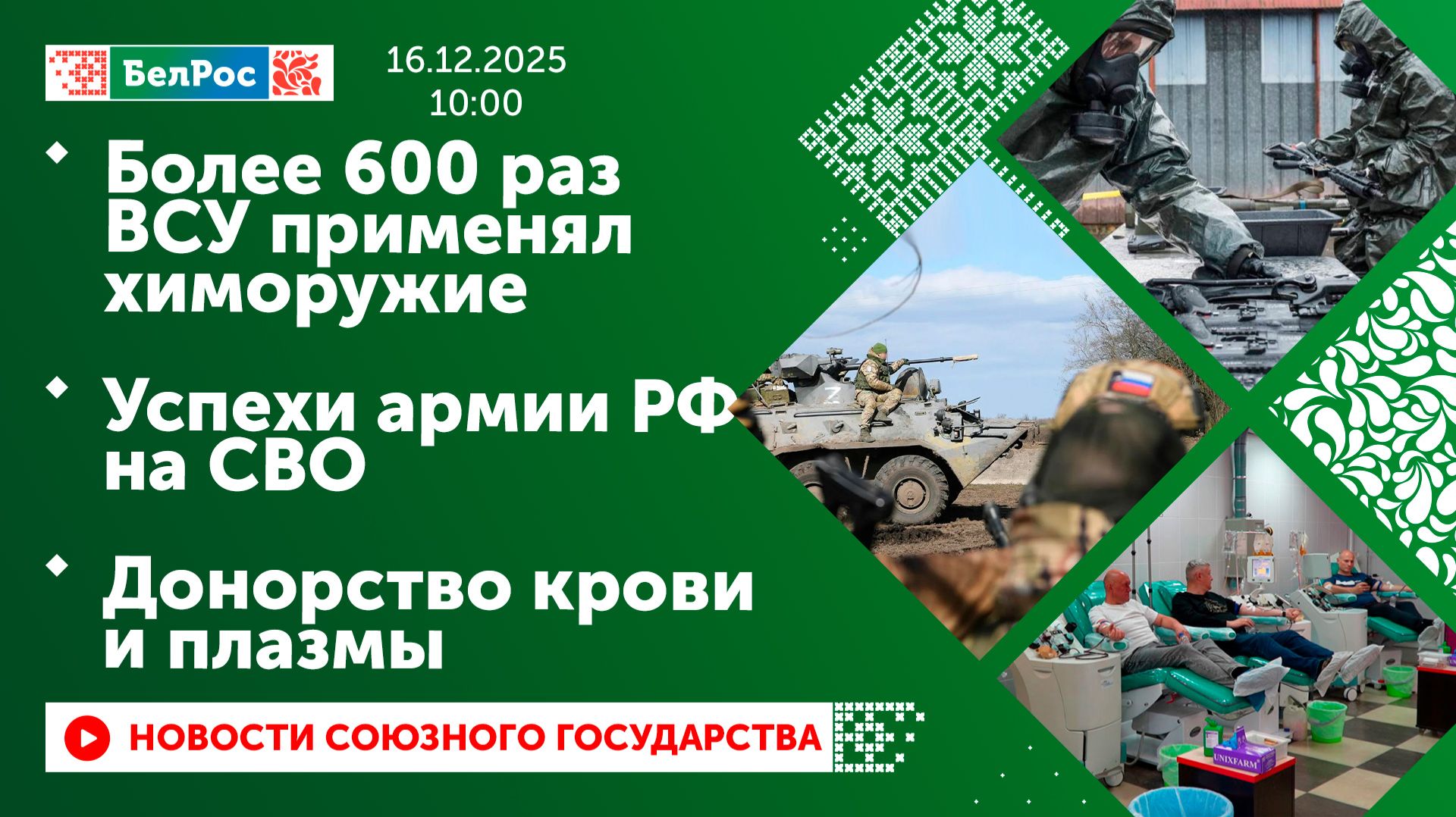 Закадровый текст озвучивает *ИИ Антон* Новости 16.12.2025 на 10:00 - В ходе СВО задокументировано более 600 случаев применения ВСУ химических средств. - Бойцы группировки войск "Восток" освободили посёлок песчаное в Днепропетровской области. - Расчёты дронов "Молния-2" группировки войск "Запад" поддержали штурмовиков в ДНР. - Экипаж ТОС-1А "Солнцепёк" группировки "Север" поразил позиции ВСУ в Харьковской области. - Около 500 волонтёров Белорусского Красного Креста стали донорами крови и плазмы. Смотрите главные новости Союзного государства на телеканале БелРос. Ссылки на наши соц. сети Сайт: http://belros.tv/ Telegram: https://t.me/belrostv Одноклассники: https://ok.ru/group/55657426976918 ВКонтакте: https://vk.com/belrostv TikTok: https://www.tiktok.com/@belros_tv?_t=... RuTube: https://rutube.ru/channel/23501830/ Яндекс. Дзен: https://zen.yandex.ru/belrostvv Наши подкасты на Яндекс. Музыке: https://music.yandex.ru/album/25615251 #главныеновости #новостисегодня #СоюзноеГосударство