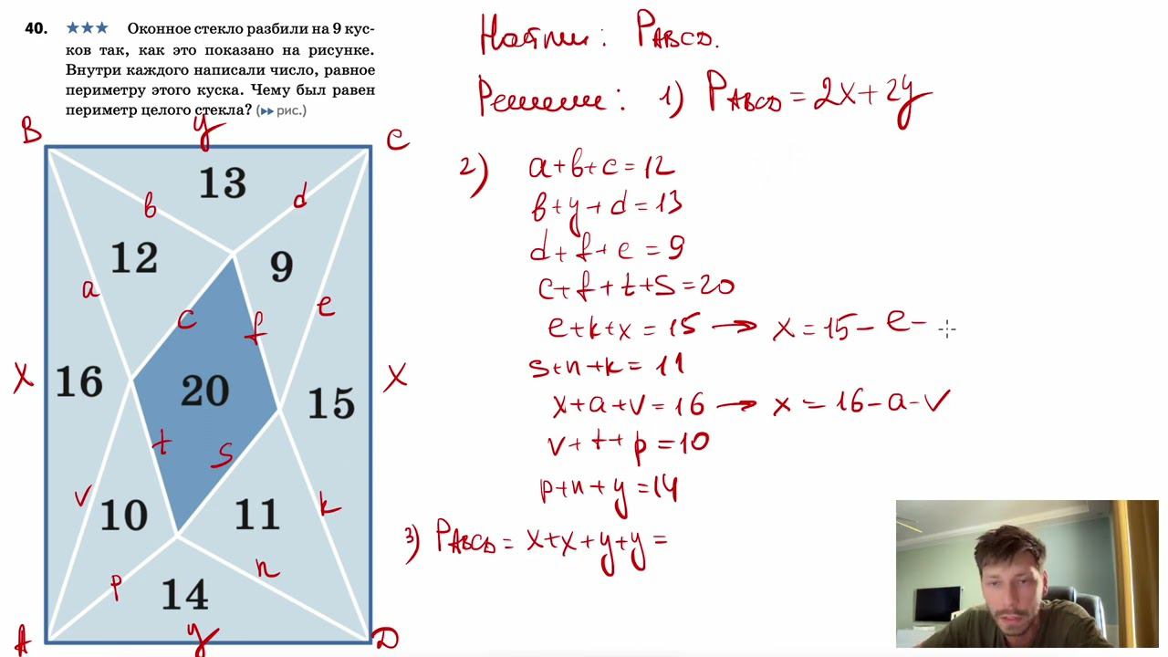 №40. Оконное стекло разбили на 9 кусков так, как это показано на рисунке. Внутри каждого написали число, равное периметру этого куска. Чему был равен периметр целого стекла? Сайт - https://tap.link/sumin Группа VK - https://vk.com/sumin55 Телеграм - https://t.me/geometry0 Канал для подготовки к ЕГЭ и ОГЭ - https://www.youtube.com/ЕвгенийСумин TikTok - https://vm.tiktok.com/WJJwK9 VK - https://vk.com/evgeniysumin