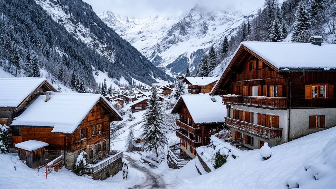 Сильный снегопад в горной деревне Мюррен, Швейцария 4K — настоящая сказочная деревня