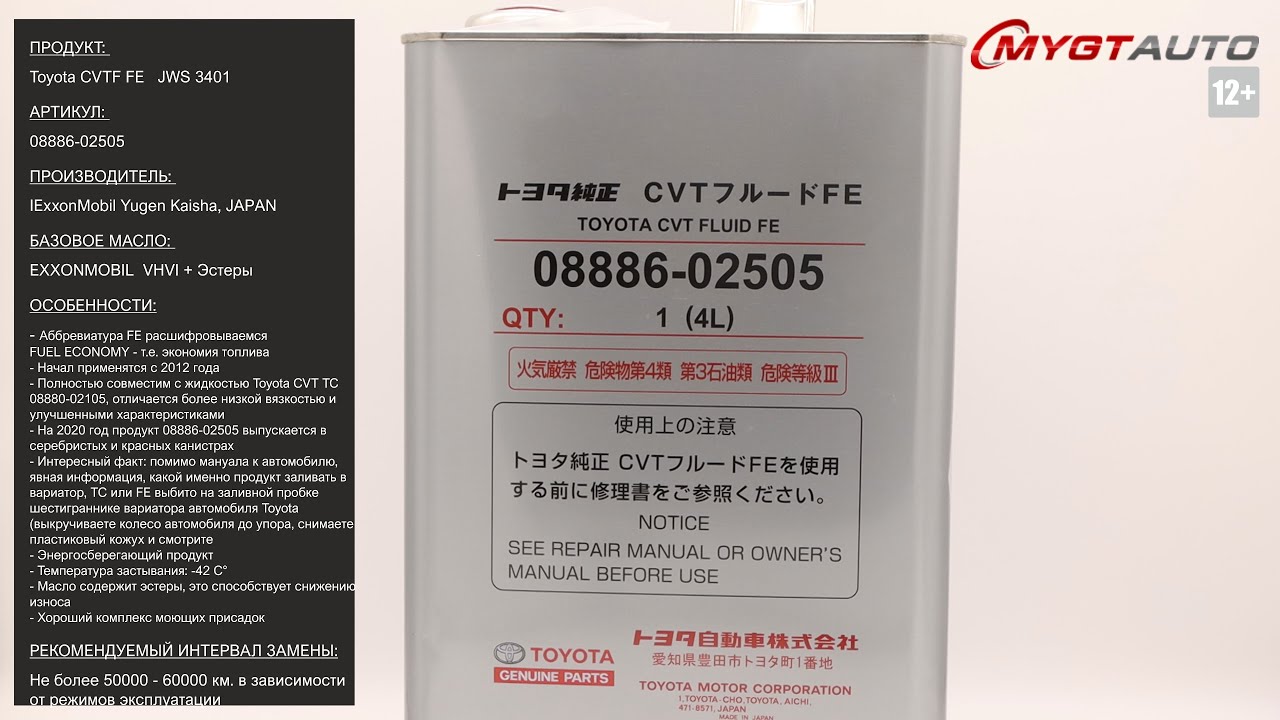 Продукт: Жидкость для вариатора Toyota CVTF FE JWS 3401 Наш телефон: 8-800-550-57-22 ПН-ПТ 9.00-17.00 (МСК+4) Артикул: 08886-02505 Производитель: ExxonMobil Yugen Kaisha, Япония Базовое масло: EXXONMOBIL VHVI + Эстеры Ссылка для покупки: https://mygt.ru/Oil/selection/toyota-cvt--fe-4-l--maslo-v-akpp.html Особенности: - Аббревиатура FE - FUEL ECONOMY - экономия топлива - Начал применяться с 2012 года - Полностью совместим с жидкостью Toyota CVT TC 08880-02105, отличается более низкой вязкостью и улучшенными характеристиками - На 2020 год продукт 08886-02505 выпускается в серебристых и красных канистрах - Интересный факт: помимо мануала к автомобилю, явная информация, какой именно продукт заливать в вариатор, ТС или FE выбито на заливной пробке шестиграннике вариатора автомобиля Toyota (выкручиваете колесо автомобиля до упора, снимаете пластиковый кожух и смотрите) - Энергосберегающий продукт - Температура застывания: -42°С - Масло содержит эстеры, это способствует снижению износа - Хороший комплекс моющих присадок - Рекомендуемый интервал замены: не более 50000 - 60000 в зависимости от режимов эксплуатации. Отличие упаковки оригинала: - Ровный сварной шов на боку канистры - Шлифовка метала на ручке типа bridge перпендикулярно - Следы от колесиков конвейера на дне упаковки в виде параллельных полос - Дата производства тары на дне упаковки должна быть ровна или ранее даты блендирования продукта Ссылки на дополнительные материалы по продукту а так же SDS: http://nskrobot.ru/images/FOTO/MYGT_RU/08886-02505.pdf #характеристикимасла0888602505 #моторноемасло #antonmygt #mygtru #mygtauto #oemcatalog Наш сайт: MYGT.RU Наш канал ПРАВДА ПРО АВТОМАСЛА: https://www.youtube.com/channel/UC5JygfcXAA5Xq18sxUx_wIQ/ Телефон: 8 800 550 57 22 Бесплатно по России. Внимание! Полное либо частичное копирование данного материала без согласия автора допускается только при указании ссылки на источник (данный канал). Все права защищены. ANTON_MYGT #anton_mygt #anton_voronkov #mygtauto #масломан #каталог масел и спецжидкостей