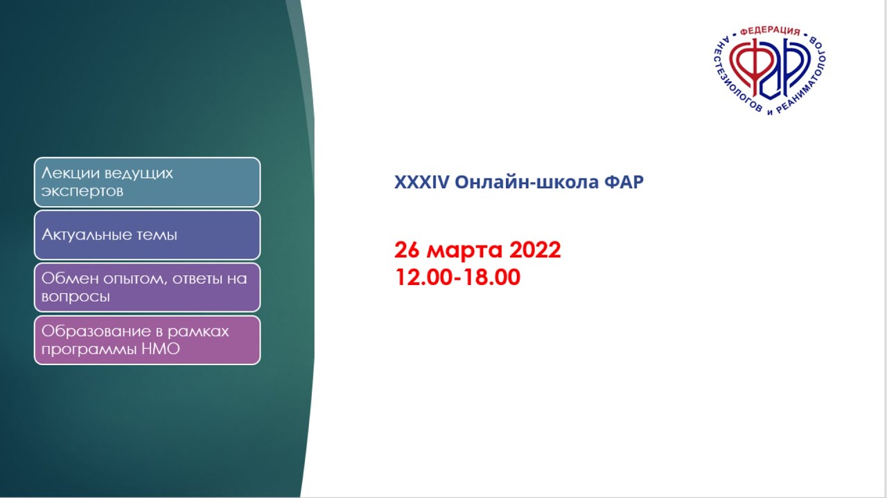Видеозапись XXXIV Онлайн-Школы ФАР, 26.03.2022, https://faronline.ru/ 00:03:00 Вячеслав Сергеевич Афончиков "Профилактика тромбозов и венозного тромбоэмболизма в отделениях реанимации "общего профиля" 01:07:39 Алексей Евгеньевич Карелов "Особенности лечения боли в спине малоинвазивными методами в условиях пандемии COVID-19" 02:09:49 Алексей Мурадович Овезов "Роль современной ингаляционной анестезии в реализации программ ускоренной реабилитации после операции"