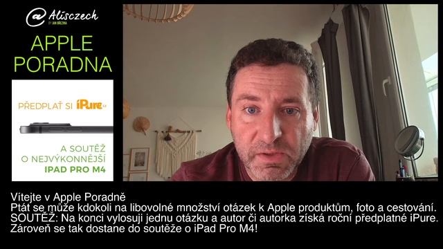 Veřejná APPLE Poradna je tradiční formát, kdy se kdokoli z diváků může prostřednictvím chatu ptát na cokoli ohledně Apple produktů, focení a cestování. Výběr techniky, aplikací a služeb, řešení problémů, doporučení postupu. Já se budu snažit během hodiny co nejrychleji zodpovědět co nejvíc dotazů. Soutěž: Na konci poradny vylosuji jeden dotaz a jeho autorka či autor získá roční předplatné iPure ONE a tím bude zařazen do soutěže o iPad Pro M4! Chcete jej taky vyhrát? Zapojte se do soutěže na: https://ipure.cz/vyhrajte-uzasny-ipad-pro-m4-i-s-prislusenstvim/ Vítězem je Jaroslav Filip Chcete podpořit můj kanál a získat exkluzivní odměny? Připojte se na: https://www.youtube.com/channel/UCekj-N41yVma9Z5oxbl7G8Q/join Další skvělá videa na http://www.alisczech.cz Sledujte mě na sociálních sítích: Facebook: http://www.facebook.com/alisczech Twitter: http://www.twitter.com/alisczech Instagram: http://www.instagram.com/alisczech Ještě víc Apple informací? http://www.ipure.cz http://www.digit.cz http://www.macforum.cz http://www.appliste.cz http://www.applenovinky.cz