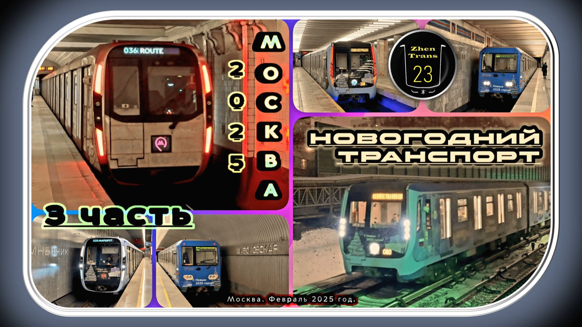 В этом видео я показал последнюю третью часть зимнего сборника новогодних метропоездов 2025 в Москве. Снято в феврале 2025 года. Поддержка моего канала - 2202 2023 6913 7413. Тайм-коды к видео: 00:00 – Начало. 00:25 – 19 февраля 2025 год. Перегон «Рязанский проспект» — «Выхино» Таганско-Краснопресненской линии (платформа «Выхино» Казанского направления Московской железной дороги D3). Новогодняя «Москва» (65175-65176) едет на Котельники. 01:18 – Станция «Волгоградский проспект». Новогодняя «Москва» едет на Планерную. 02:39 – Станция «Полежаевская». Новогодняя «Москва» едет на Котельники. 04:15 – Станция «Мнёвники» Большой кольцевой линии. Новогодняя «Москва-2020» (75141-75142) едет по часовой стрелке. 05:51 – Станция «Рижская». Новогодняя «Москва-2020» (75081-75082) едет против часовой стрелки. 07:12 – Станция «Сходненская» Таганско-Краснопресненской линии. Новогодняя «Москва» (65175-65176) едет на Планерную. 08:33 – Станция «Шаболовская» Калужско-Рижской линии. Новогодняя «Ока» (37079-37080) едет на Новоясеневскую. 09:56 – 20 февраля. Станция «Белорусская» Кольцевой линии. Тематический новогодний «Ледяной» поезд «Москва-2020» (75049-75050) едет против часовой стрелки. 11:22 – 21 февраля. Станция «Павелецкая». Новогодняя «Москва-2020» (75087-75088) едет по часовой стрелке. 11:50 – Станция «Новогиреево» Калининской линии. Новогодняя «Ока» (37025-37026) едет на Новокосино. 13:24 – Концовка. VK страница: https://vk.com/evgeniynaumov23 Telegram-канал: https://t.me/ZhenTrans23 Telegram-группа: https://t.me/zhentrans23chat Дзен: https://dzen.ru/zhentrans23 RUTUBE: https://rutube.ru/channel/23921395/ YouTube: https://www.youtube.com/@zhentrans23/videos