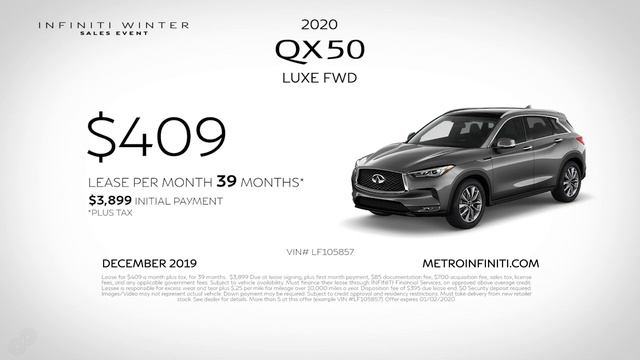 Lease a new 2020 INFINITI QX50 LUXE FWD for $409p/mo plus tax. $3,899 due at signing. https://www.metroinfiniti.com/VehicleSearchResults?search=new&make=INFINITI&trim=LUXE%20FWD&model=QX50&year=2020