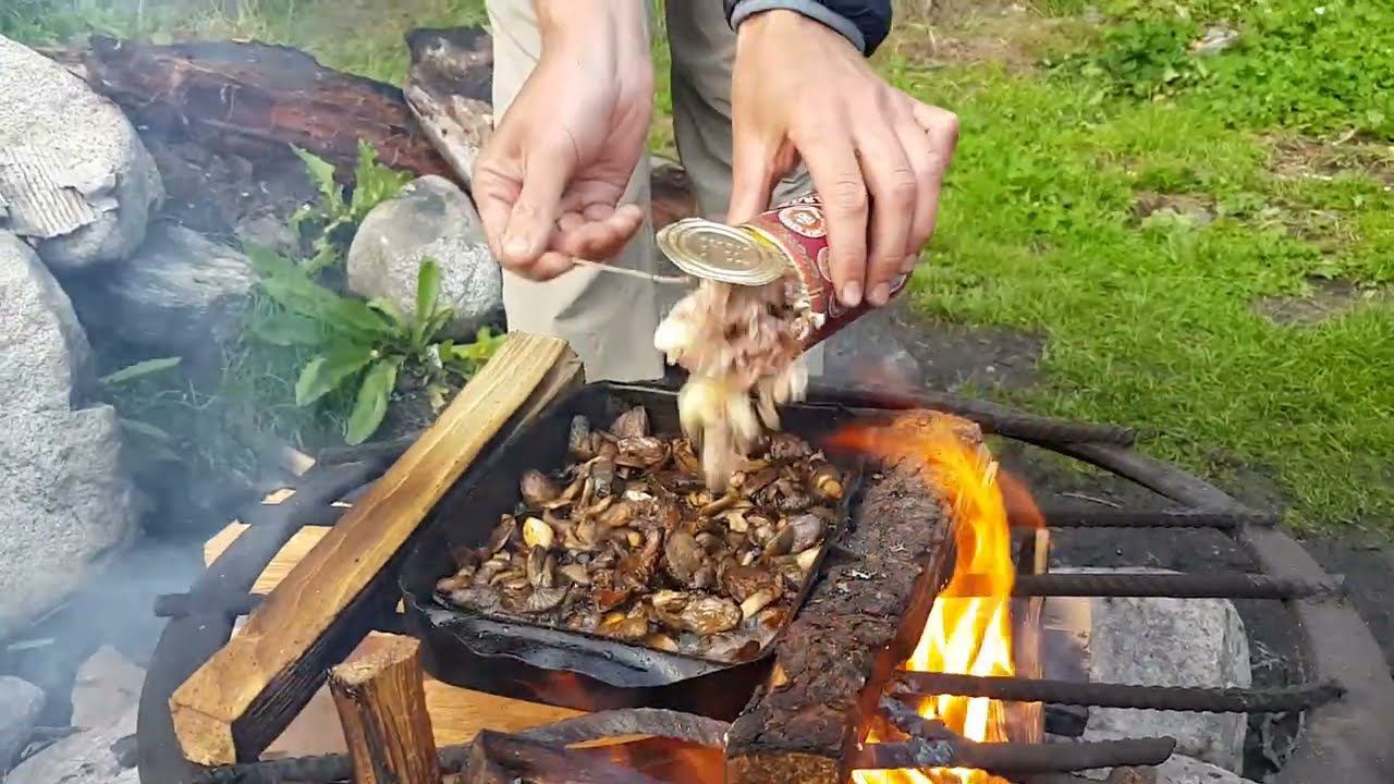 Лесная кухня| Грибы с тушёнкой на костре.