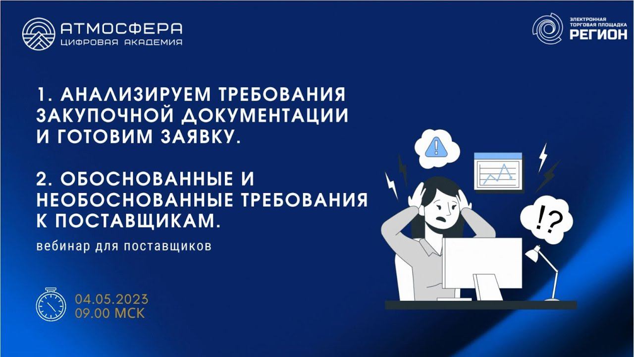 Подписывайтесь на нас в социальных сетях, чтобы не пропустить свежие новости: https://academy-atmosphere.ru/zakupki https://t.me/academy_atmosfera https://vk.com/academy_atmosfera https://rutube.ru/channel/24606397/ 00:00 Вступление 02:03 Приветствие спикера Маслову Елену Александровну 02:26 Анализируем требования закупочной документации и готовим заявку 03:23 Требования Заказчика 06:28 Общие требования к участнику (единые) 09:18 Дополнительные требования 12:35 Основания для отклонения 15:35 Национальный режим 44ФЗ 19:46 44-ФЗ. Конкурентные закупки 20:56 Извещение закупки 44ФЗ 21:15 Извещение 44ФЗ. Документы. 22:53 Преимущества 26:50 Требования к участникам 32:28 Ограничения и запреты 34:33 Техническое предложение (ТП) 37:10 Конкурс 44-ФЗ. Заявка участника 41:19 Конкурентные закупки 223ФЗ 41:39 Закупки для СМП 223-ФЗ. Состав заявки 43:00 Национальный режим. 223ФЗ 43:44 Национальный режим. 223ФЗ. Практика 45:39 Требования к заявке. Пример 49:29 Порядок оценки и сопоставления заявок 50:44 Примеры требований (2 часть заявки) 54:45 Минфин Письмо от 20.12.2022 N 24-07-07/124769 55:12 Отклонение заявки. Практика 56:20 Ответы на вопросы участников 01:07:02 Приветствие спикера Балякину Елену Борисовну 01:07:15 Обоснованные и необоснованные требования к поставщикам 01:07:57 Сфера охвата 01:10:38 Установление требований к УЗ 01:15:49 Примеры обоснованных требований к УЗ 01:16:45 Участники закупки 01:18:12 Примеры обоснованных требований к УЗ 01:25:34 Примеры необоснованных требований к УЗ 01:45:14 Ответы на вопросы участников